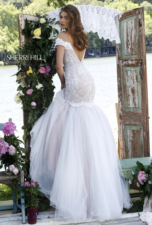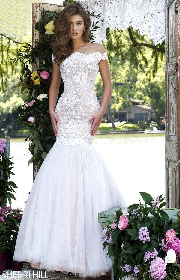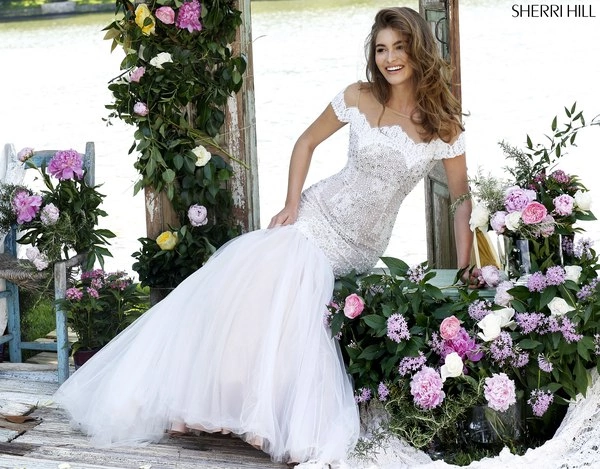 Платье по фигуре силуэта русалка. Корсет из расшитого кружева с закрытым верхом и вырезом лодочка. Юбка из фатина.