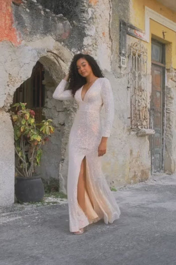 Облегающее платье с длинными рукавами и пайетками, V-образным вырезом и разрезом на юбке.