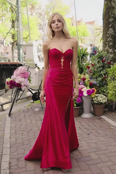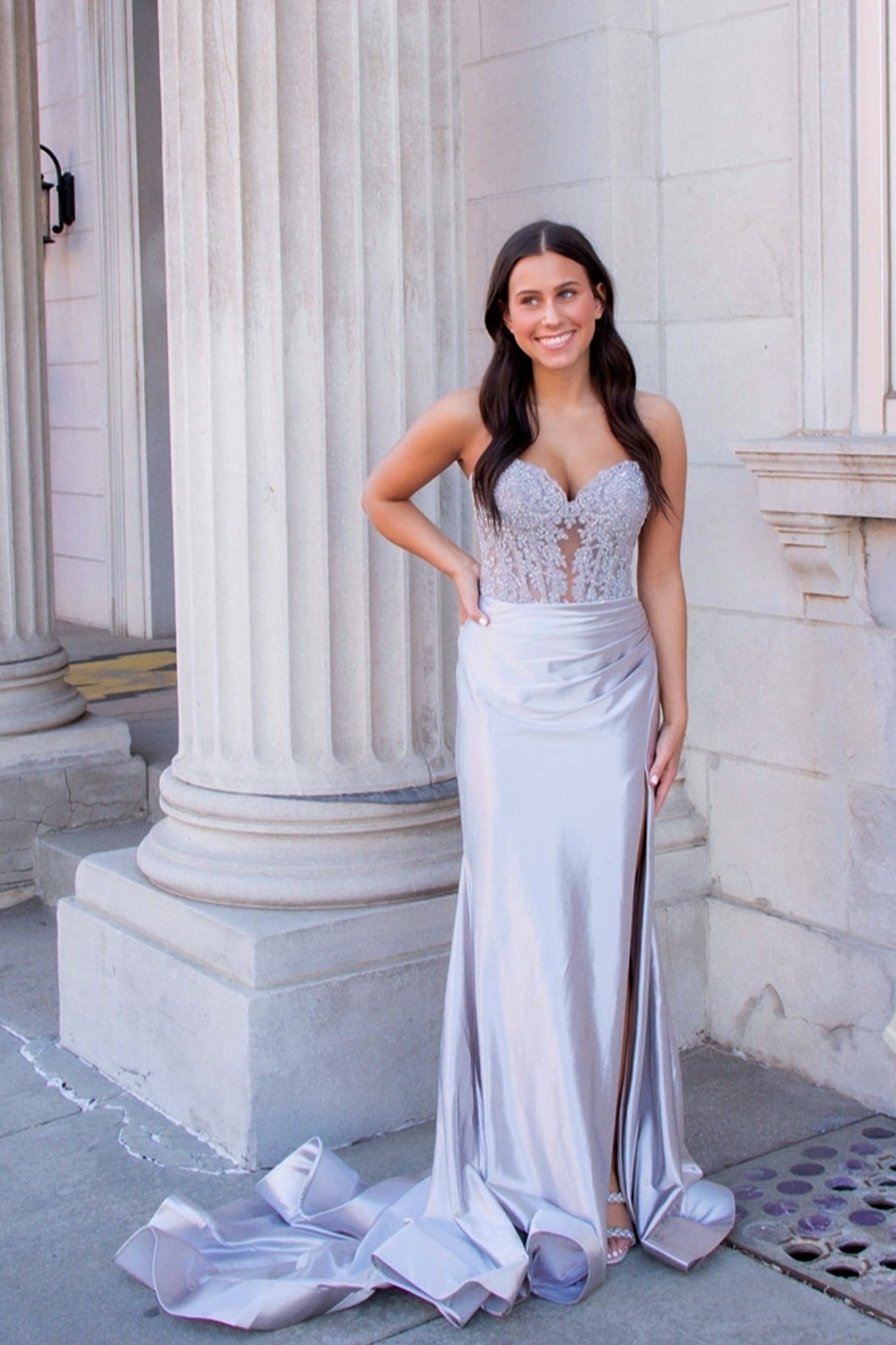 Приталенное платье по фигуре с открытыми плечами, с кружевным, украшенным стразами, корсетом, и разрезом на юбке из эластичного атласа.