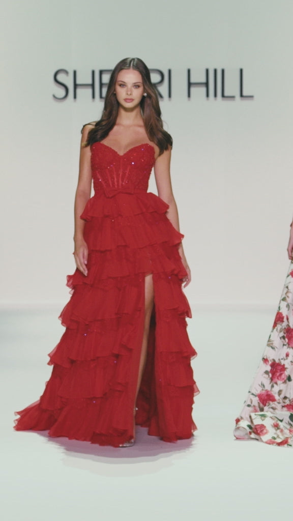 Платье А-силуэта с открытыми плечами, расшитым кружевным корсетом, юбкой из шифона и расшитого кружева с оборками и разрезом. Бантик на талии. Шнуровка на спине.
