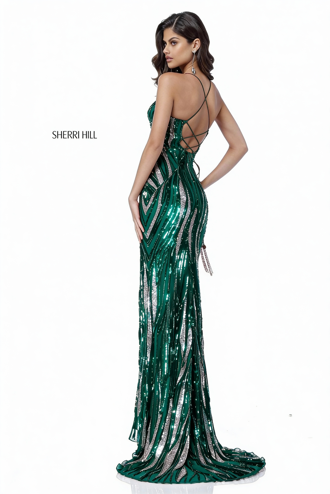 Приталенное платье по фигуре полностью расшитое пайетками, с разрезом на юбке и перекрещивающимися бретелями на спине.