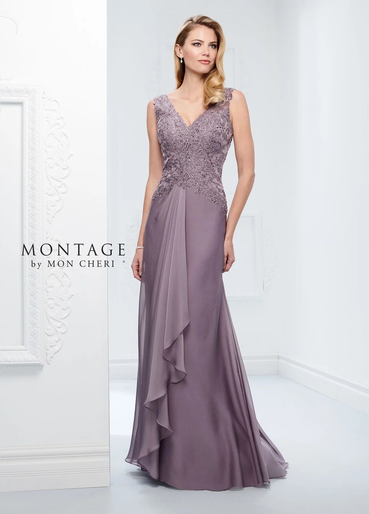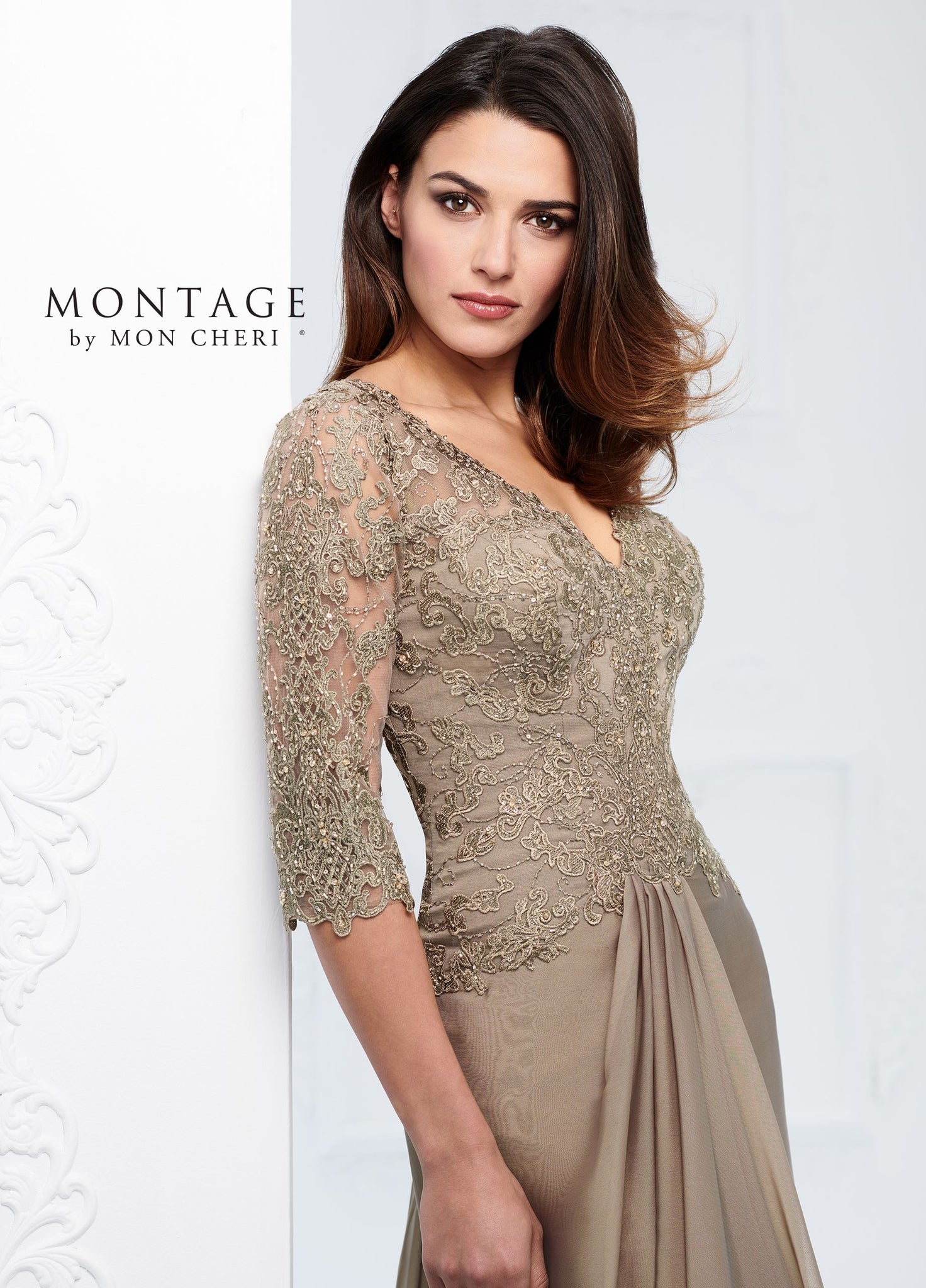 Платье А-силуэта из шифона и кружева, V-образными вырезами спереди и сзади, лифом в форме сердца из расшитого вручную кружева, многослойной юбкой со сборкой по центру и каскадной оборкой, лёгким шлейфом. В комплект входят дополнительные рукава из кружева длиной три четверти и шаль в тон.