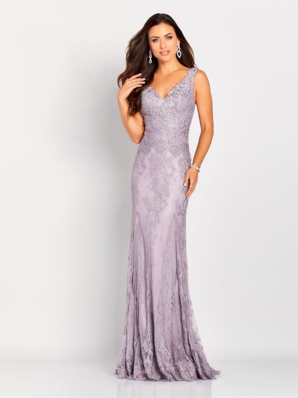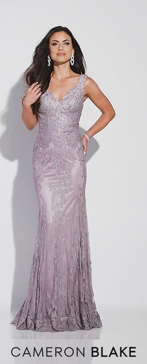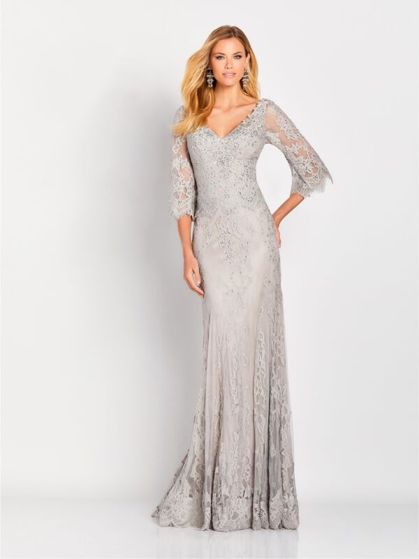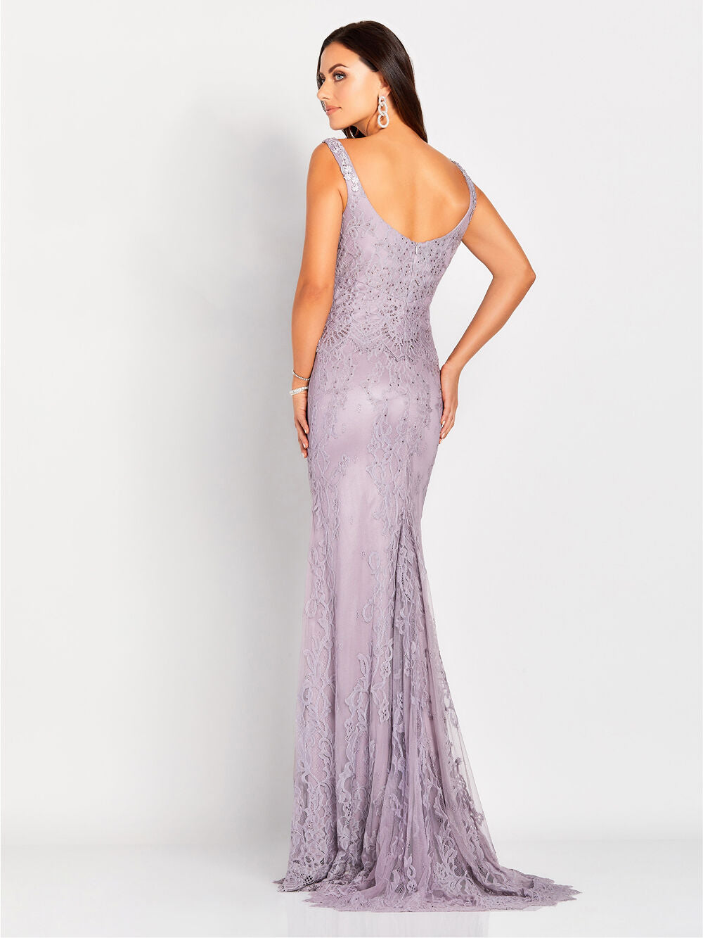 Это вечернее платье выполнено из расшитого кружева, с отстегивающимися рукавами три четверти, обрамляющими V-образный вырез и глубокий вырез на спине. Силуэт платья расклешается к низу и заканчивается шлейфом. В комплект входит шаль в тон.