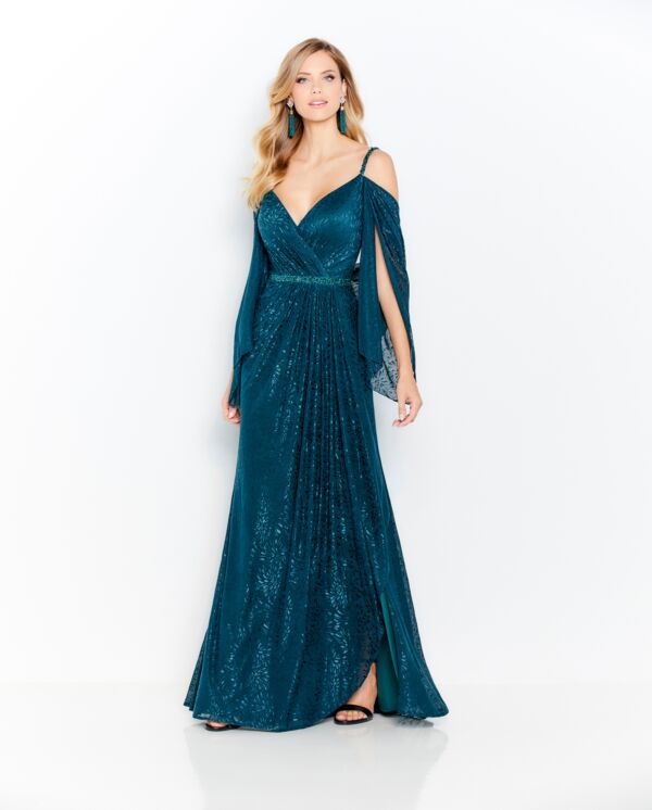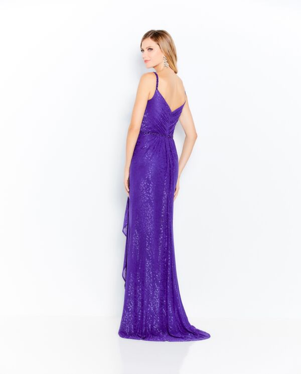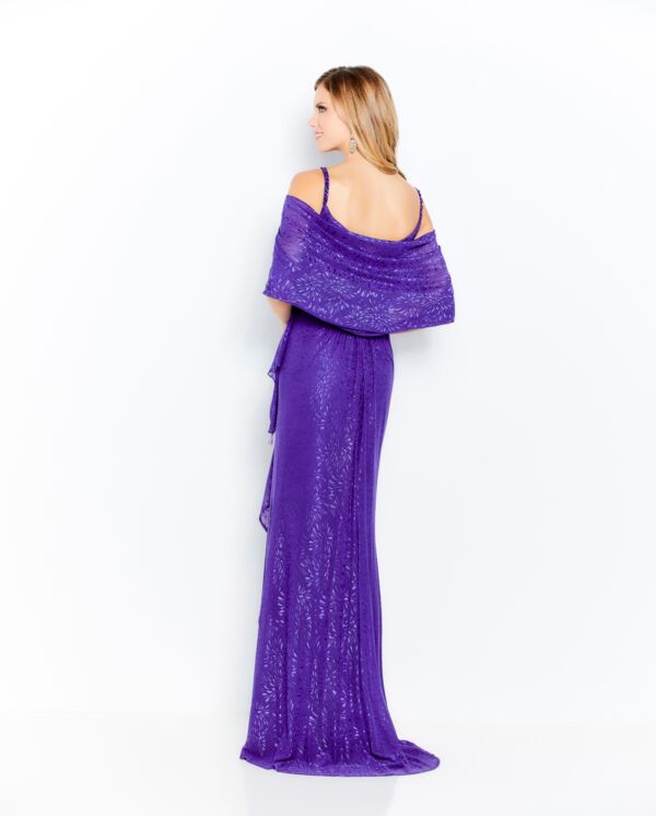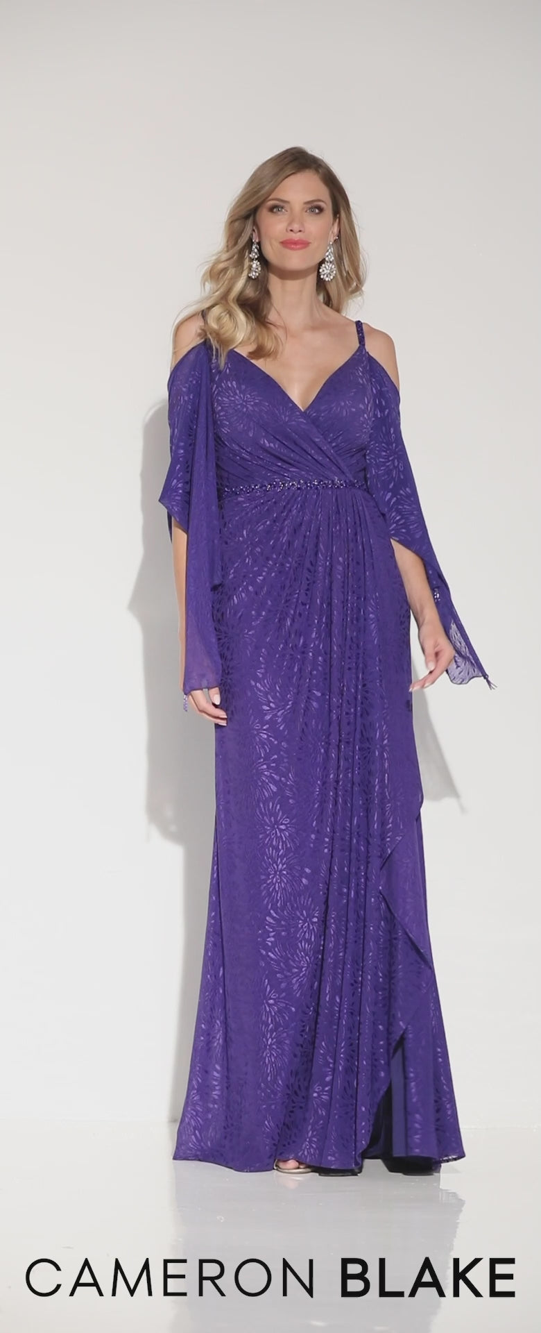 Вечернее платье с имитацией запаха из эластичной ткани с тонкими бретельками, расшитыми бисером, обрамляет V-образный вырез и спинку. Лиф с рюшами дополняет юбку со сборками, украшенную поясом, расшитым бисером. В комплект входит съёмная шаль.
