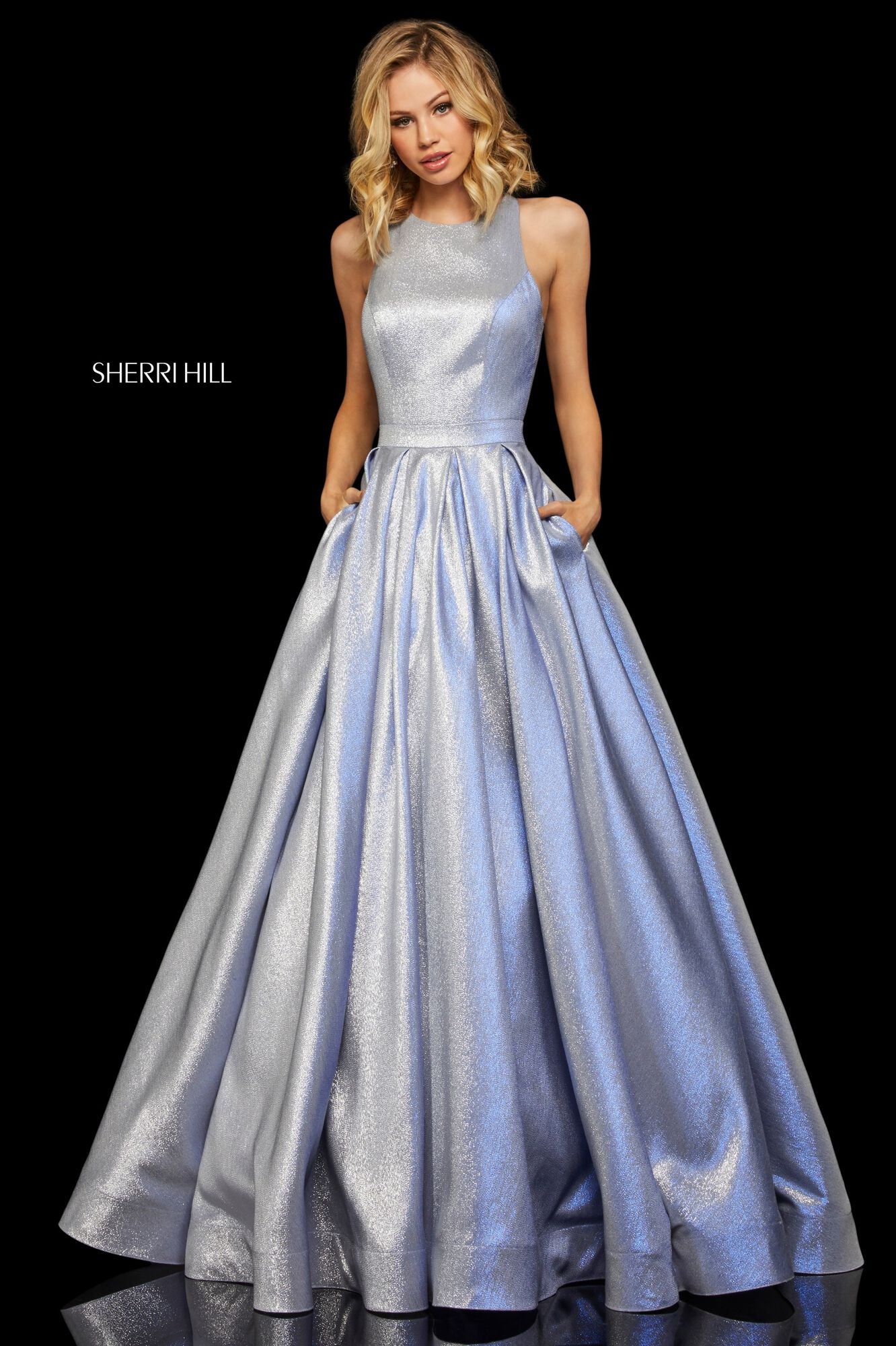 Бальное платье с вырезом американка и открытой спиной из мерцающей ткани.