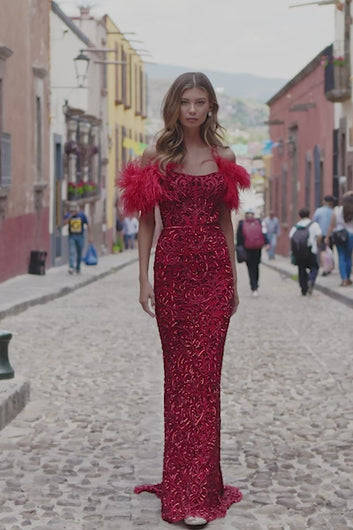 Полностью расшитое бисером платье по фигуре с перьями на плечах и шнуровкой сзади.