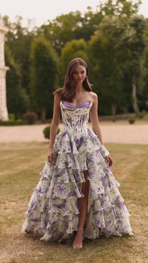 Нежное платье в стиле принцессы с корсетным лифом без бретелек подчёркивает линию плеч и декольте. Пышная многоярусная юбка из лёгких, волнистых слоёв создаёт воздушный объём и красиво струится при движении. Деликатный оттенок айвори в сочетании с цветочным принтом в пастельных тонах придаёт образу романтичность и утончённость, а продуманный крой подчёркивает фигуру, оставаясь при этом комфортным для длительной носки.