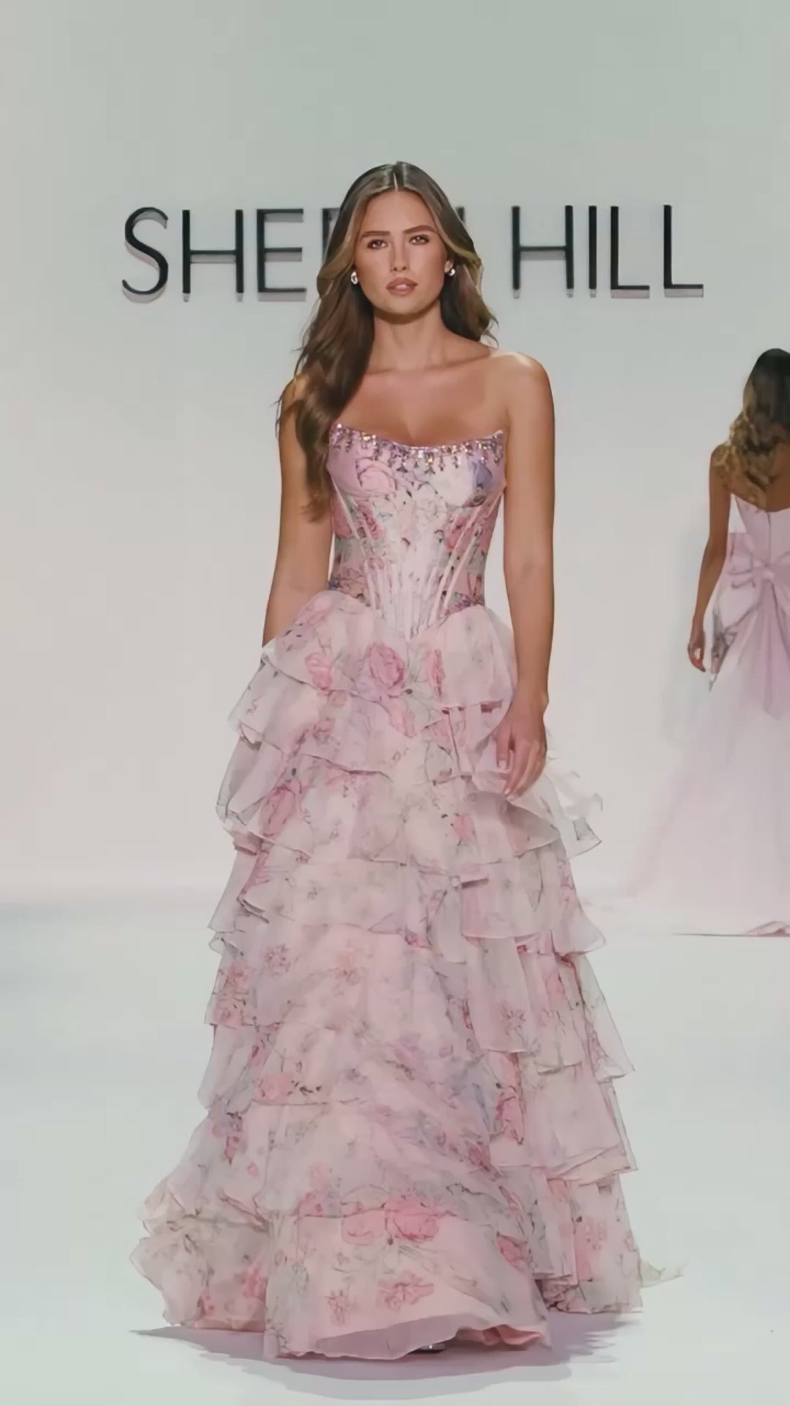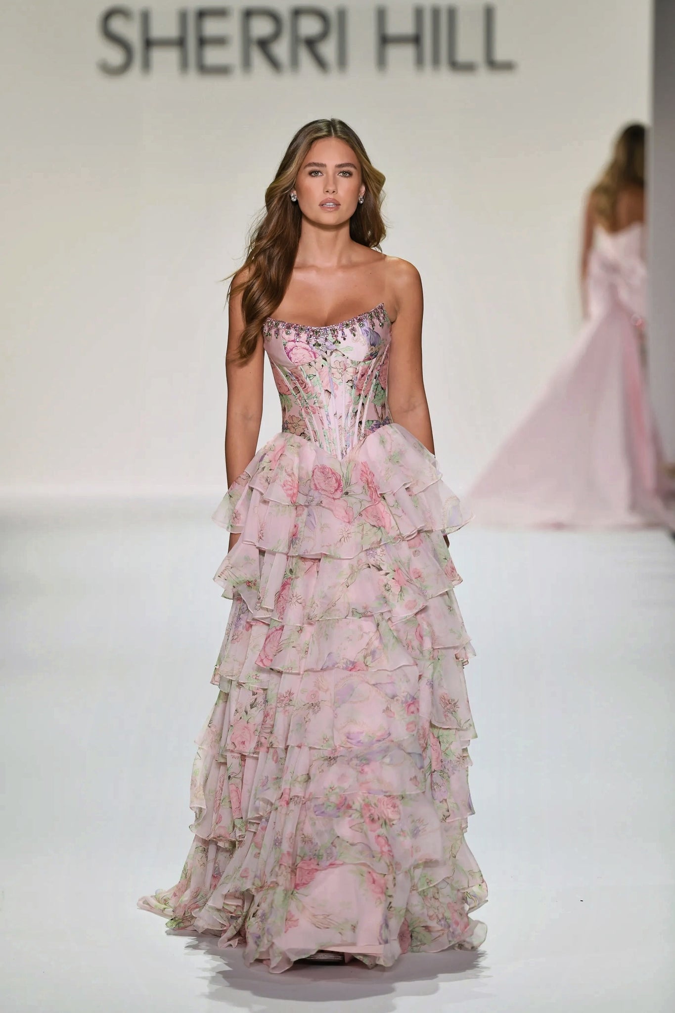 Платье с открытыми плечами, А-силуэта, с цветочным принтом, корсетным лифом и юбкой из шифона с оборками.