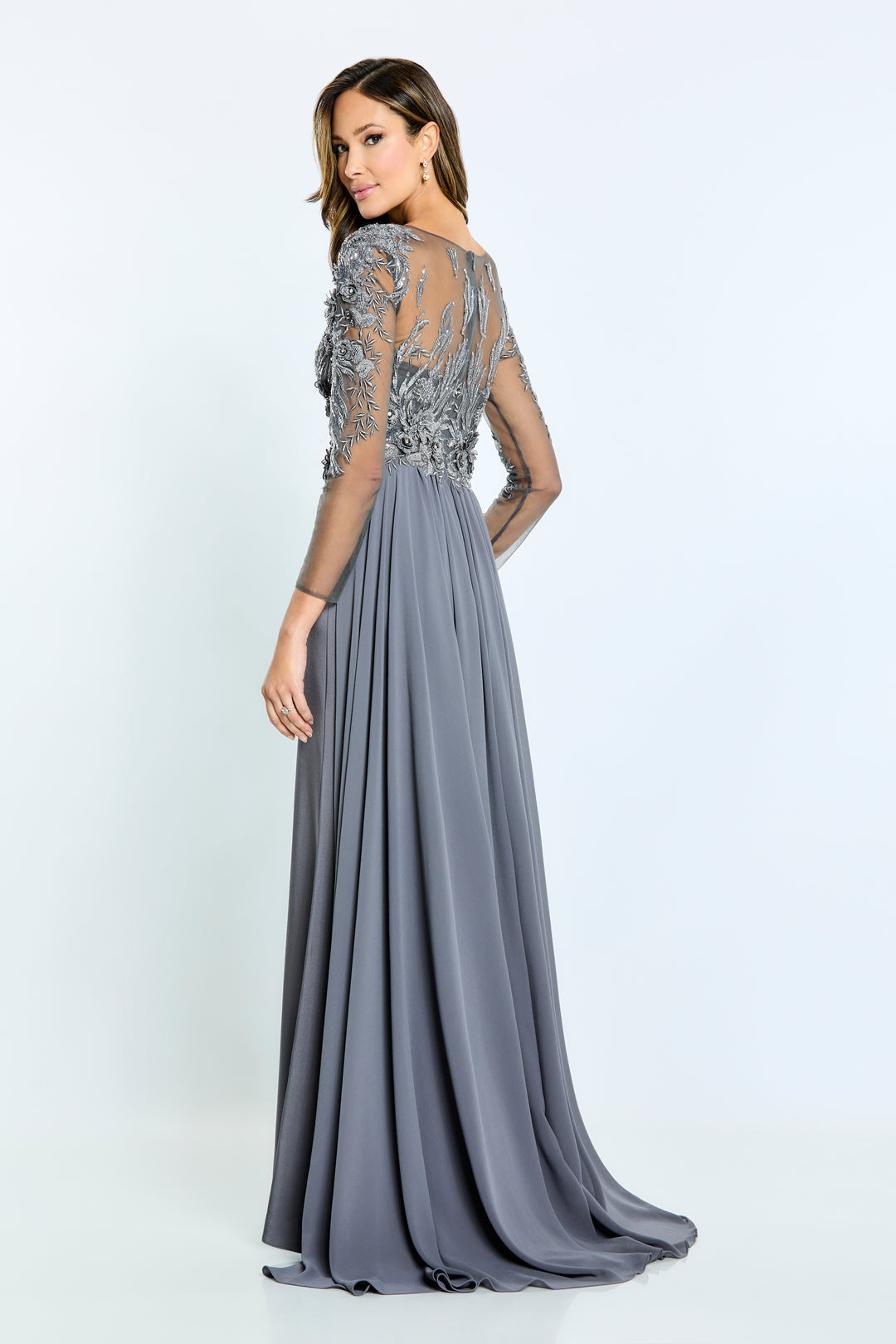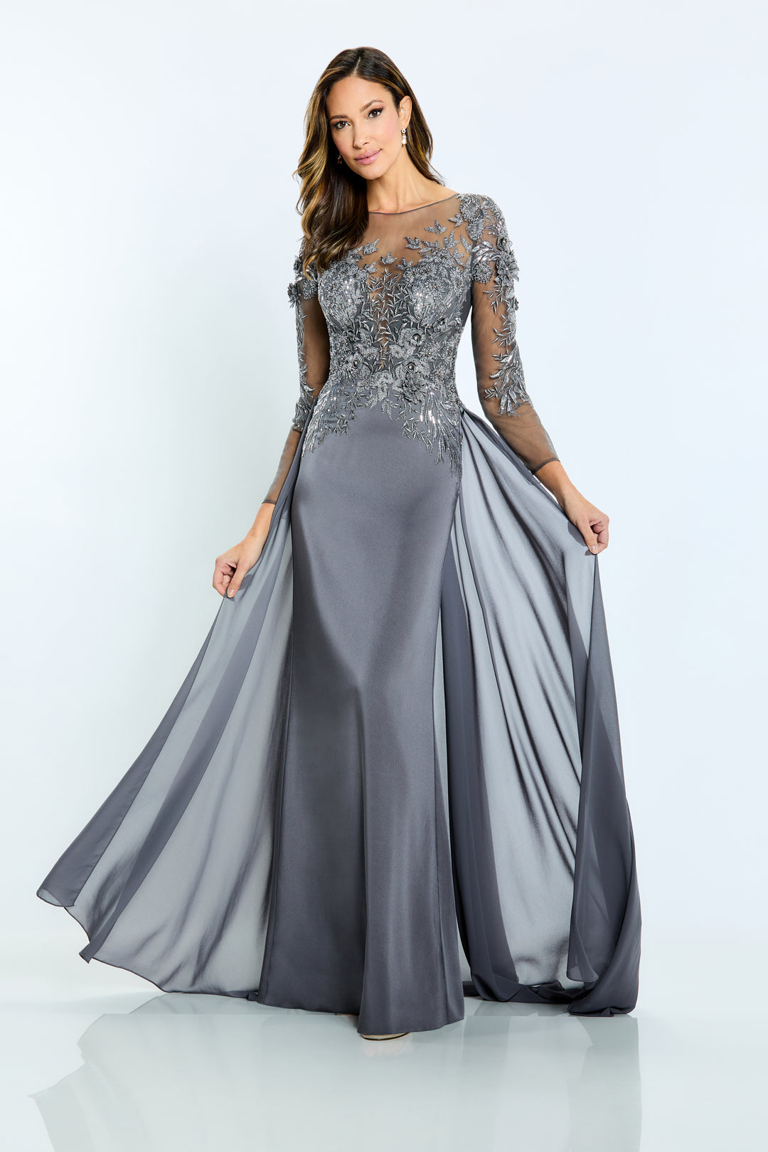 Окунитесь в изысканный гламур с платьем Mon Cheri Montage M509, искусно сочетающим шифон и креп, которое окутывает вас роскошной мягкостью. Приталенный силуэт, нежная вышивка и изящная верхняя юбка создают чарующую визуальную глубину, которая легко приковывает взгляды. Прозрачный вырез и длинные рукава добавляют нотку вневременной изысканности, а невидимая молния сзади обеспечивает идеальную посадку. Это длинное платье идеально подходит для вечерних мероприятий или в качестве эффектного платья для матери невесты, оно подчеркнет ваш образ, придаст вам непринужденную сияющую и безупречную форму. Ощутите элегантность, переосмысленную в изысканном мастерстве Mon Cheri.
